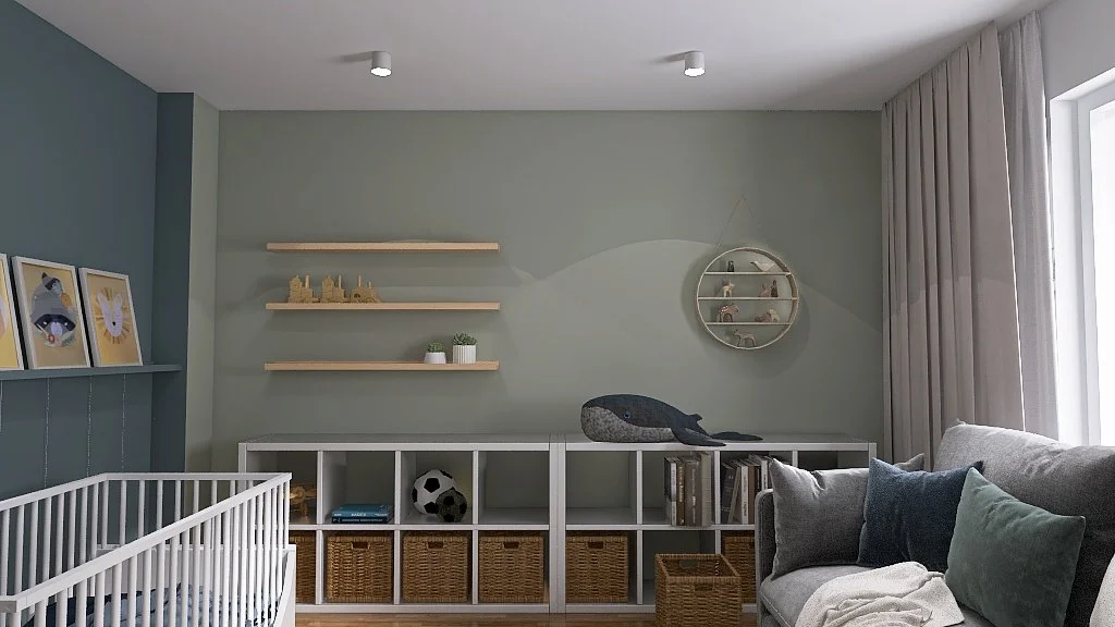 Aus dem ehemaligen Büro wird ein liebevoll gestaltetes Babyzimmer für Ihren Sohn. Die vorhandenen Möbel wie Babybett & Wickelkommode, aber auch ein Kleiderschrank & eine Schlafcouch werden in das Gestaltungskonzept integriert. So vereint das Zimmer zwei Funktionen: Es ist persönlicher Lebensraum & gleichzeitig ein einladendes Gästezimmer für Familie & Freunde.