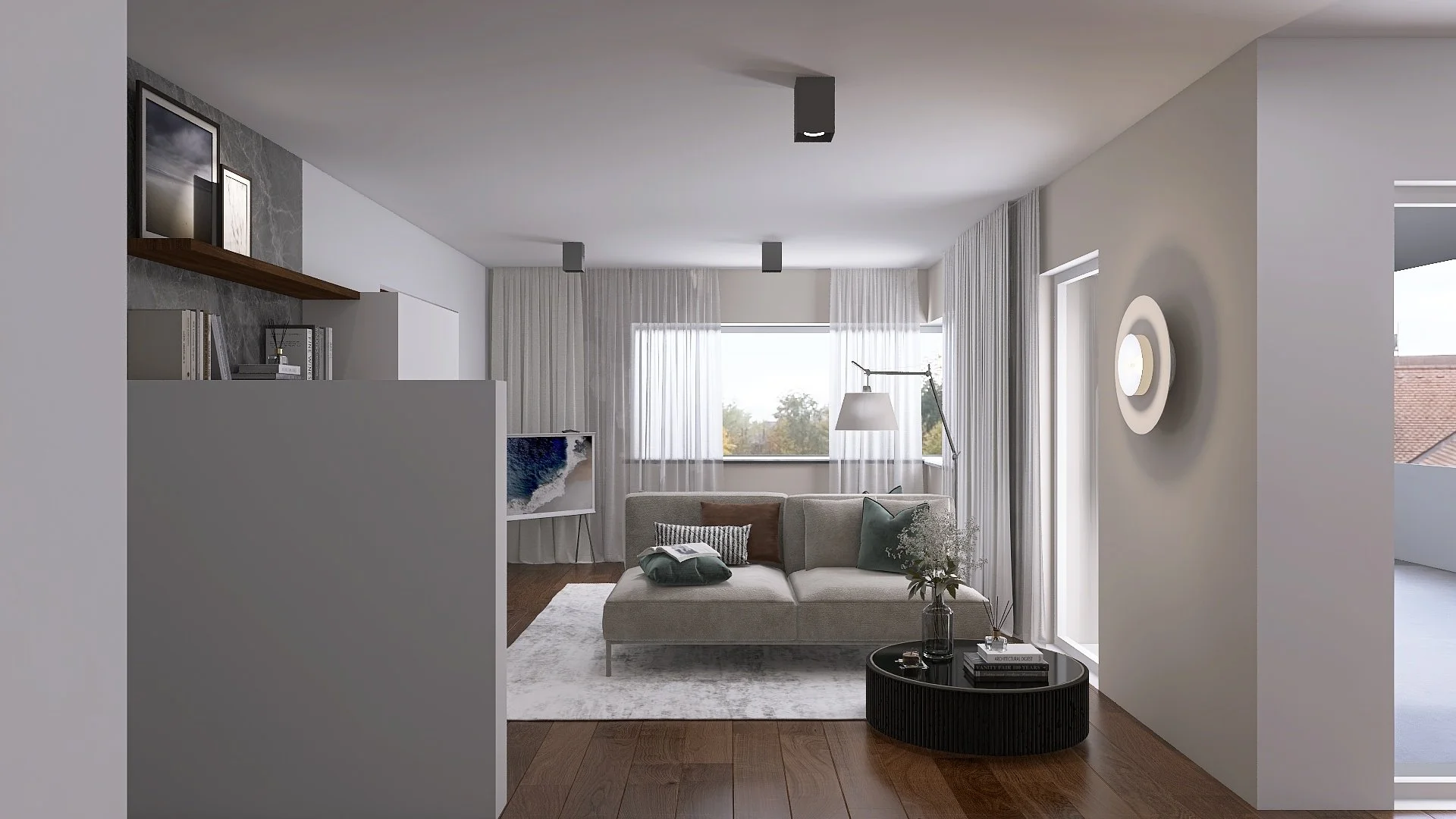 Das Interior Design setzt auf einen frischen, harmonischen Look. Die Umgestaltung des Kamins & die bewusste Raumzonierung durch die neue modulare Couch ermöglichen unterschiedliche Nutzungsszenarien: gemütliche Filmabende mit der Familie, aber auch Rückzugsmomente zum Lesen & Entspannen am Kamin.